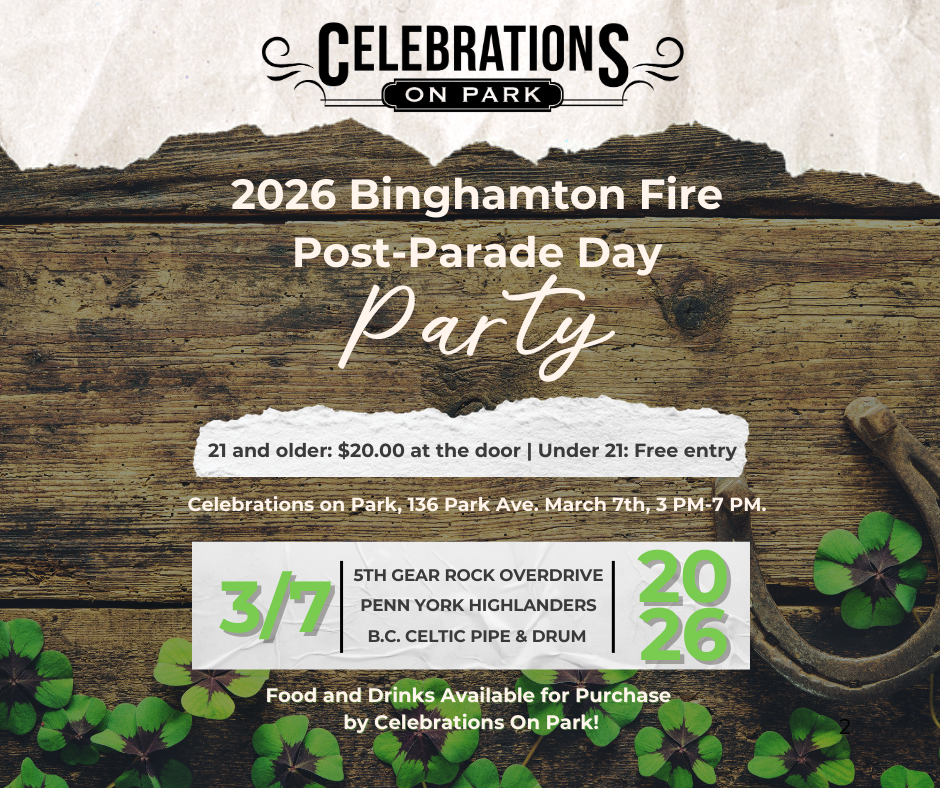 Join us on March 7th from 3:00–7:00 PM at Celebrations On Park for an afternoon packed with live music and post-parade fun, and support the Binghamton Fire Department!